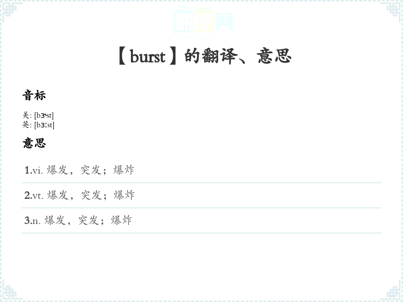 3.n. 爆发,突发;爆炸 4.n. (Burst)人名;(德、罗)布尔斯特