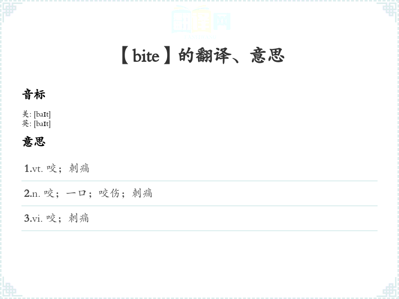 - 字面意思:字面上,“bite”是指用牙齿咬住或撕裂某物。定义为“用牙齿抓住或切割食物或其他物体”。
