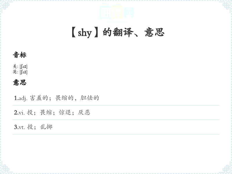 4.n. 投掷;惊跳 5.n. (Shy)人名;(英)夏伊