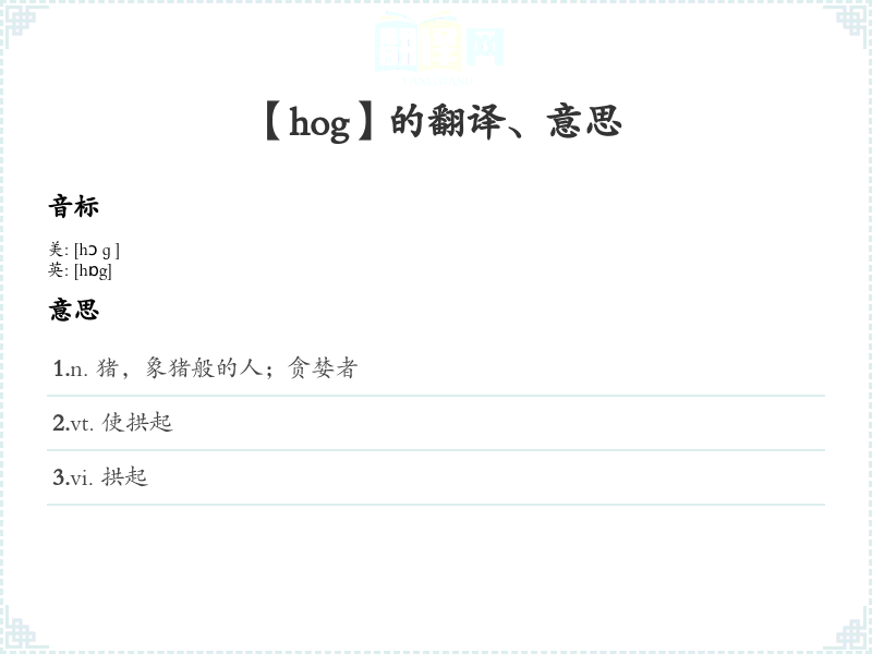 词源分析:Hog 的词源可以追溯到古英语“hoga”,最初指一种成年猪。该词没有明显的前缀和后缀,但与其他相关词(如“swine”)一同表示猪的不同种类。