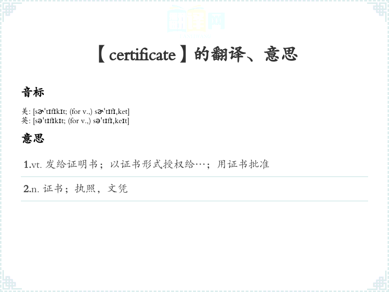 1.vt. 发给证明书;以证书形式授权给…;用证书批准 2.n. 证书;执照,文凭