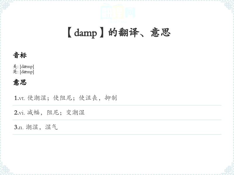 • 字面意思:字面上,"damp" 意为潮湿或略微湿润的状态。它可以用于描述空气、物体或环境的湿度。