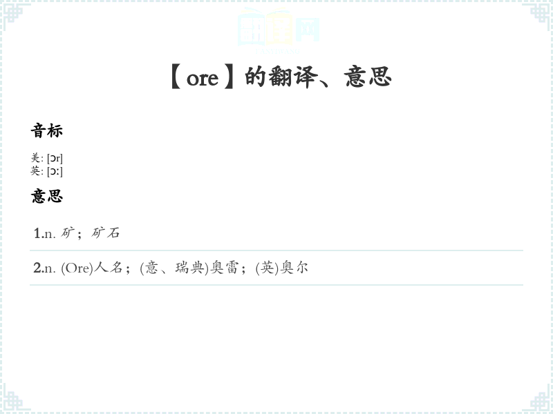 1.n. 矿;矿石 2.n. (Ore)人名;(意、瑞典)奥雷;(英)奥尔