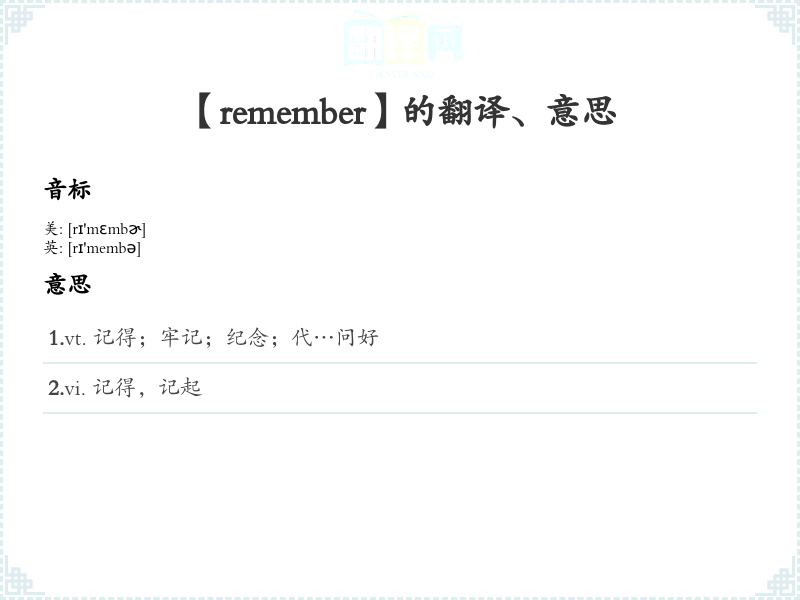 1.vt. 记得;牢记;纪念;代…问好 2.vi. 记得,记起
