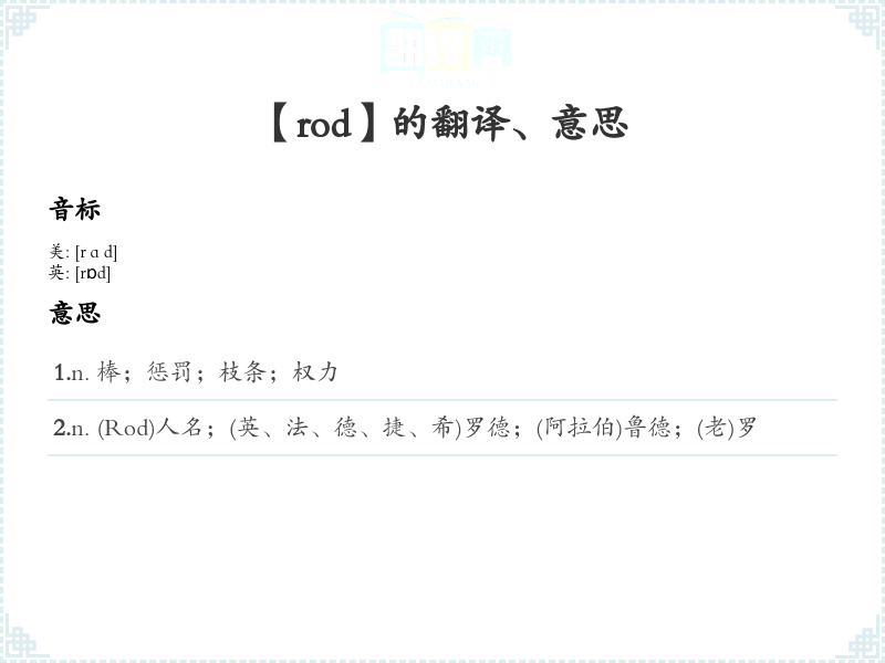 1.n. 棒;惩罚;枝条;权力 2.n. (Rod)人名;(英、法、德、捷、希)罗德;(阿拉伯)鲁德;(老)罗