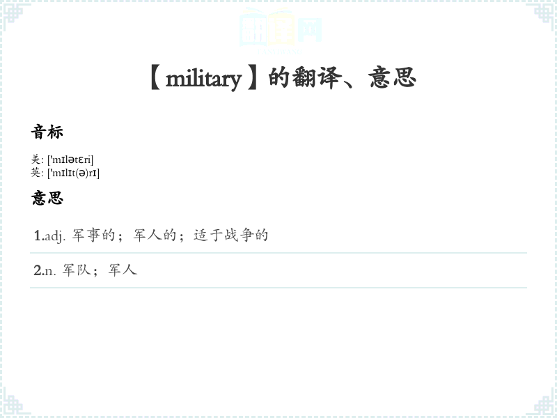- 定义:形容词,指与军队、战争或国防相关的;名词,指军队或军事力量。