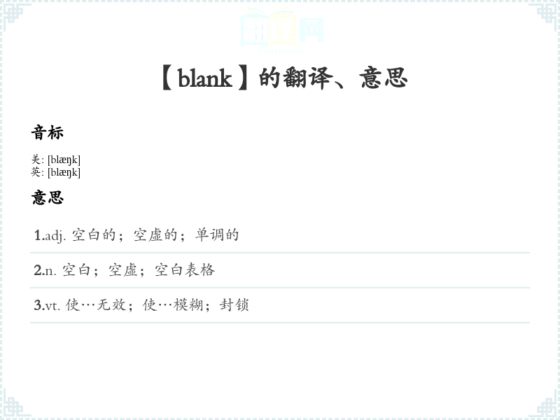 4.vi. 消失;成为空白 5.n. (Blank)人名;(法)布朗克;(英、德、西、俄、罗、捷、瑞典、芬)布兰克