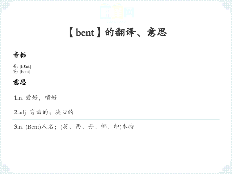 2.adj. 弯曲的;决心的 3.n. (Bent)人名;(英、西、丹、挪、印)本特