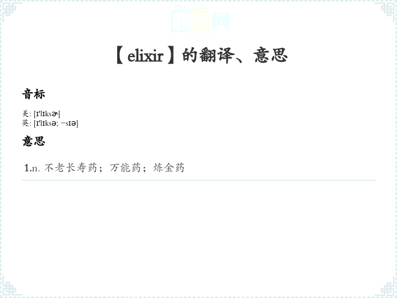 - 该词源自拉丁语“elixir”,意指“炼金术的药水”或“精华”。