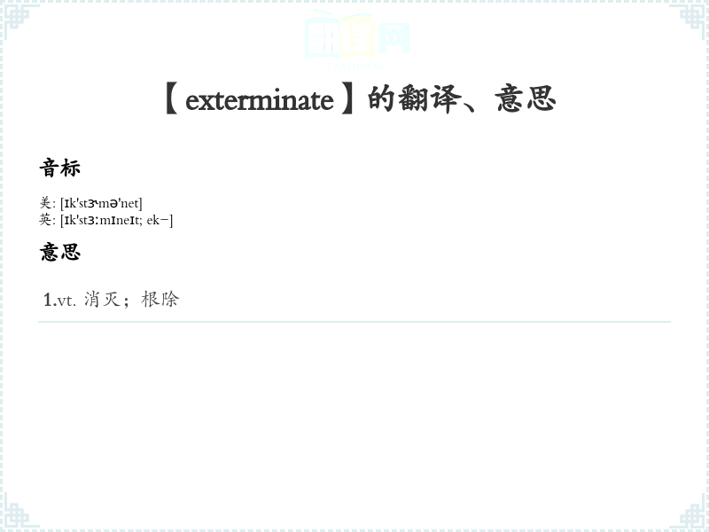 - 1. [V-T] To exterminate a group of people or animals means to kill all of them. 消灭