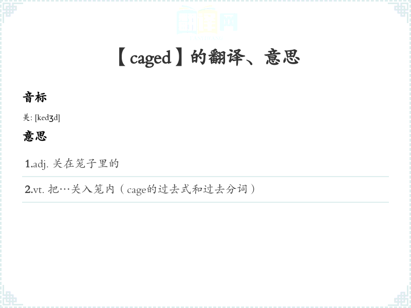 1.adj. 关在笼子里的 2.vt. 把…关入笼内(cage的过去式和过去分词)