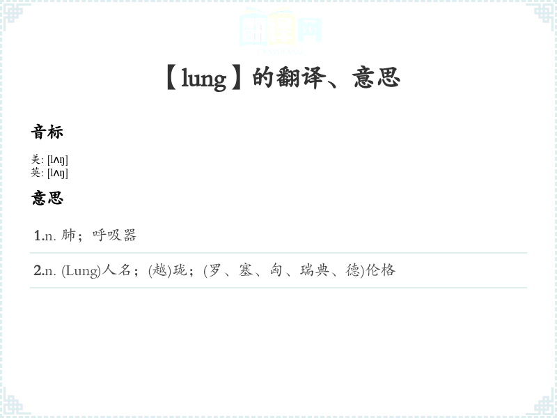 1.n. 肺;呼吸器 2.n. (Lung)人名;(越)珑;(罗、塞、匈、瑞典、德)伦格