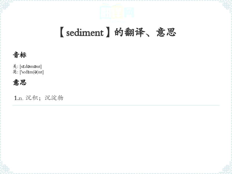 词源分析:Sediment 源自拉丁文“sedimentum”,其词根“sedere”意为“坐下”或“停留”,表示物质在液体中沉降的过程。
