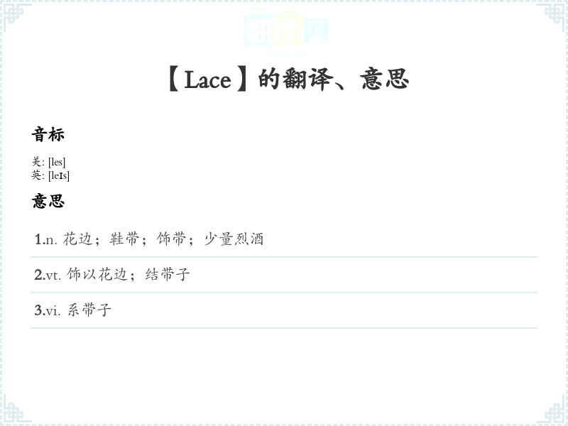 - 字面意思:Lace 指的是一种精细的织物,通常由丝、棉或合成纤维制成,通常用于装饰衣物、家居用品等。