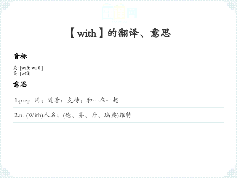1.prep. 用;随着;支持;和…在一起 2.n. (With)人名;(德、芬、丹、瑞典)维特