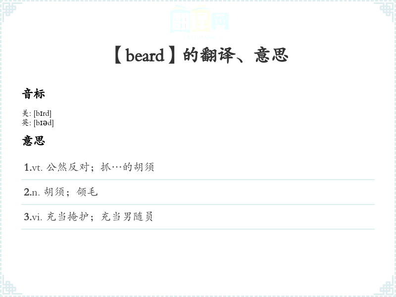 3.vi. 充当掩护;充当男随员 4.n. (Beard)人名;(英)比尔德