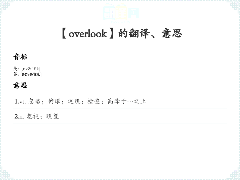 1.vt. 忽略;俯瞰;远眺;检查;高耸于…之上 2.n. 忽视;眺望