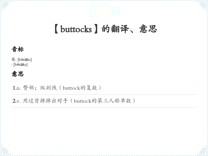 1.n. 臀部;纵剖线(buttock的复数) 2.v. 用过背摔摔出对手(buttock的第三人称单数)