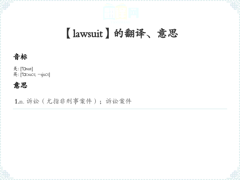 - 字面意思:字面上,“lawsuit”由“law”(法律)和“suit”(诉讼)组成。定义为在法庭上提出的法律诉讼,通常涉及一方对另一方的索赔。