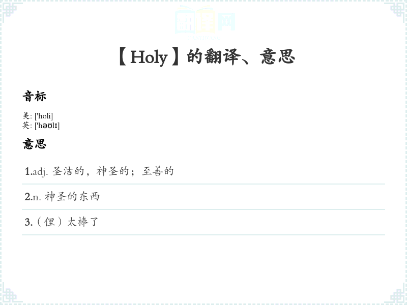 3.(俚)太棒了 4.n. (Holy)人名;(英、德、匈)霍利
