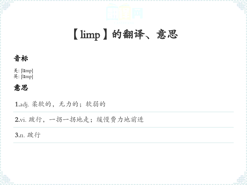 词源分析:Limp源自古英语“lympa”,意为“无力的、软弱的”。其词根可能与“limb”(肢体)相关,表明身体的某部分无力或受损。