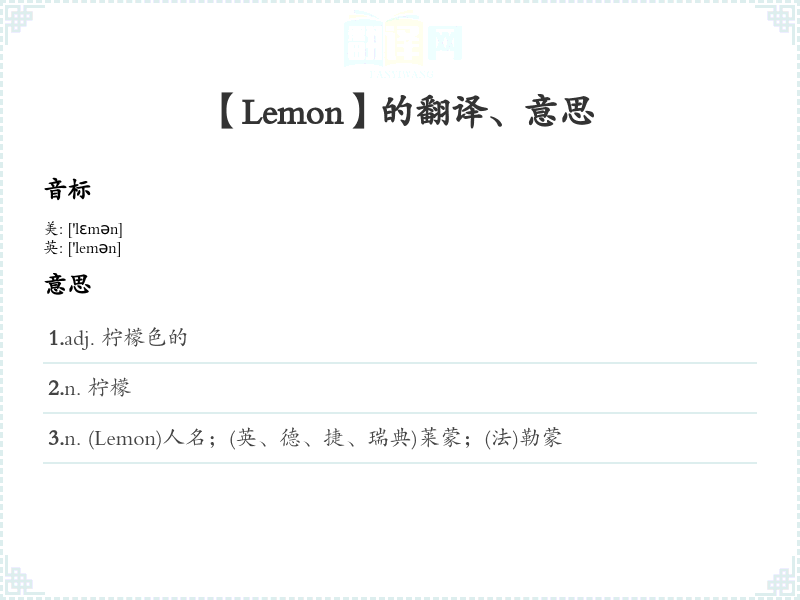 2.n. 柠檬 3.n. (Lemon)人名;(英、德、捷、瑞典)莱蒙;(法)勒蒙