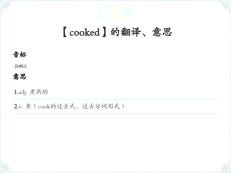 1.adj. 煮熟的 2.v. 煮(cook的过去式、过去分词形式)