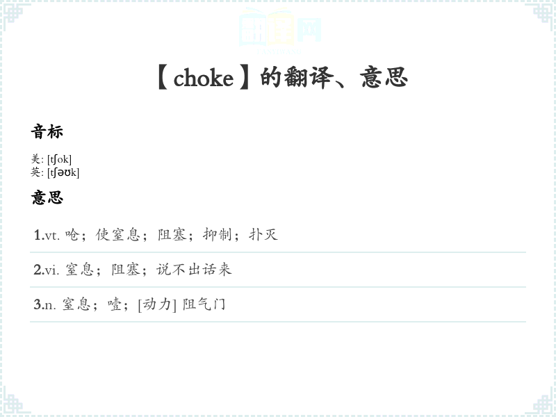 - 1. [V-T/V-I] When you choke or when something chokes you, you cannot breathe properly or get enough air into your lungs. 使窒息; 窒息