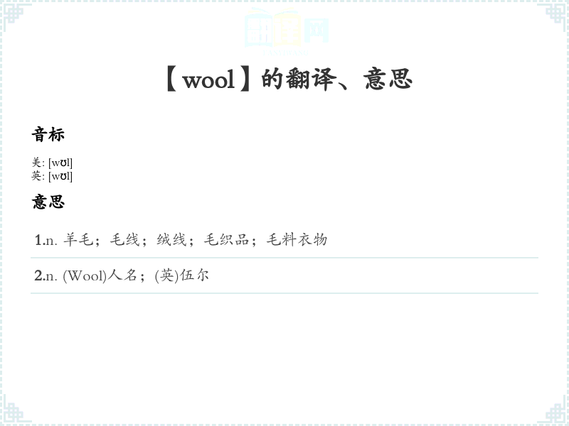 - 字面意思:Wool(毛)是从羊等动物的皮肤上获得的柔软纤维,通常用于制作衣物和织物。