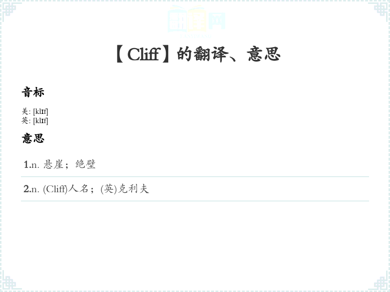 1.n. 悬崖;绝壁 2.n. (Cliff)人名;(英)克利夫