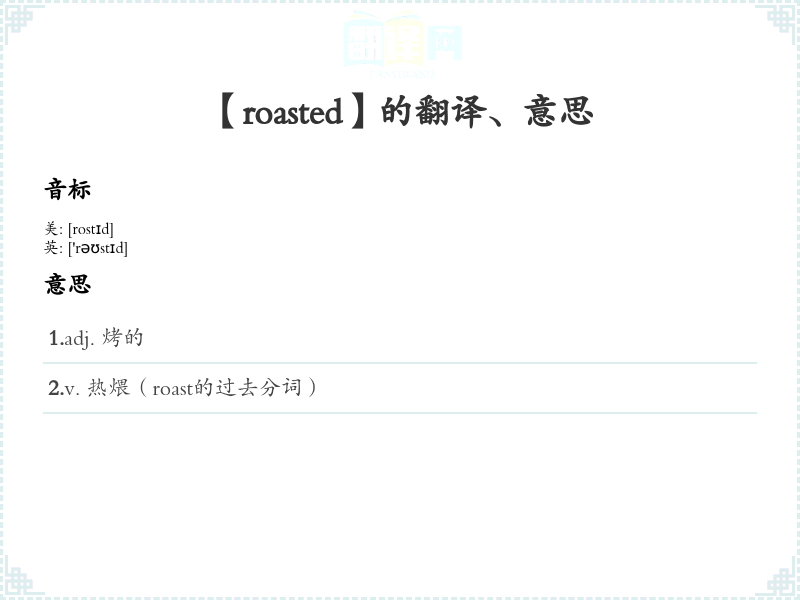 - 字面意思:字面上,"roasted" 是 "roast" 的过去分词,指通过热源(如火或烤箱)将食物(通常是肉类或蔬菜)烹饪至外表呈现金黄色或焦脆的状态。定义为:用干热的方式烹饪食物。