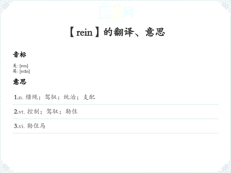 3.vi. 勒住马 4.n. (Rein)人名;(西、阿拉伯)雷因;(法)兰;(英、荷、捷、德、芬、瑞典)赖因;(爱沙)雷恩