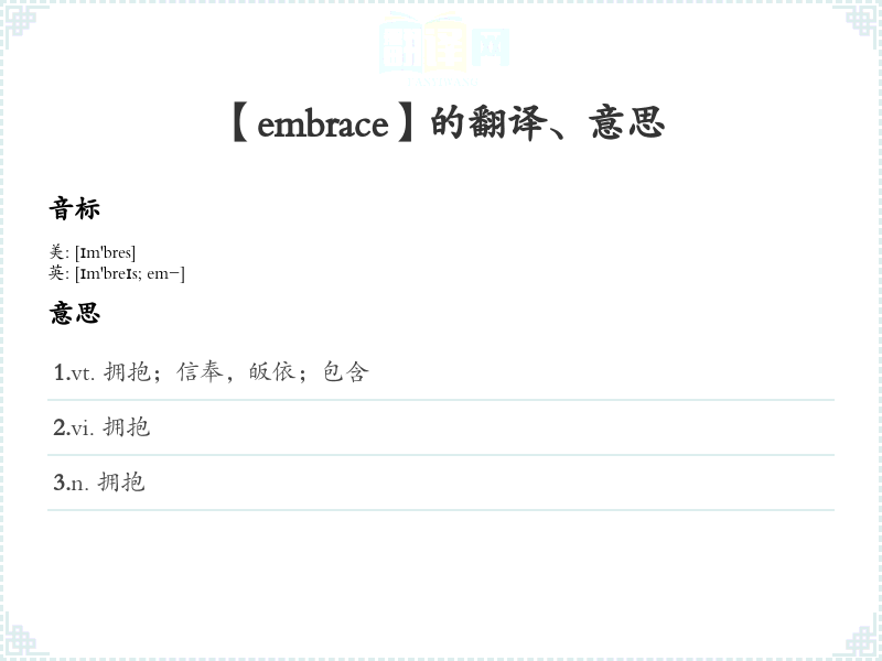- 字面意思:该单词的字面含义是“拥抱”,可以引申为接受或采纳某个观点、思想或事物。