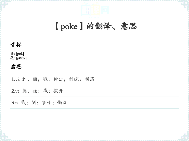 "Poke" 的字面含义是用手指或尖物轻轻地碰或戳。 - 词性: