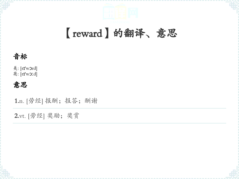 - 字面意思:'reward' 表示对某种行为或成就的回报或奖励。定义为给与某人某种形式的补偿以表彰其努力或成果。