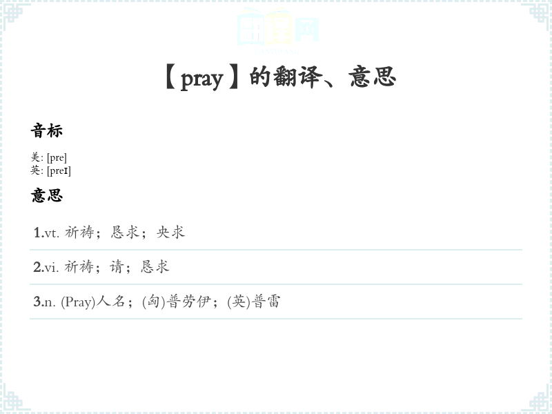 - 字面意思:pray 意为“向上帝或神灵恳求、祈求或感谢”,通常与**信仰相关。