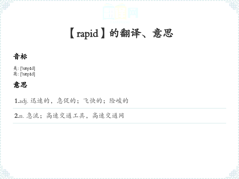- 字面意思:Rapid的字面含义是“快速的”或“迅速的”,定义为“发生或移动的速度很快”。