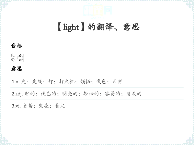 - “Light”通常指“光”或“亮度”,也可以指“轻的”或“没有重量”。它可以表示可见的光线或某种东西的轻便性。