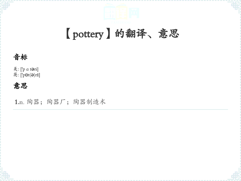 1.n. 陶器;陶器厂;陶器制造术