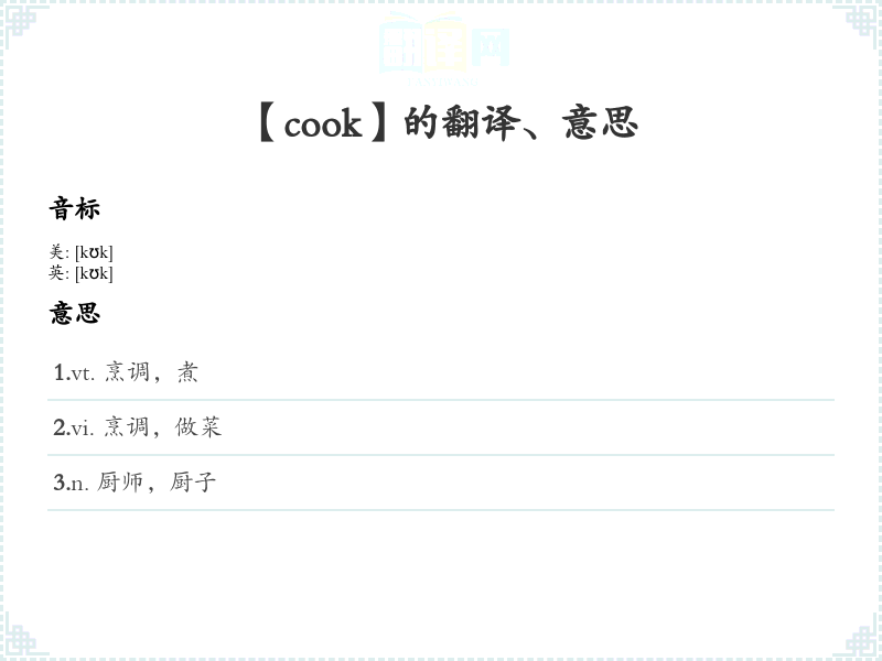 - 词性:动词(verb)和名词(noun)。作名词时,指“厨师”。