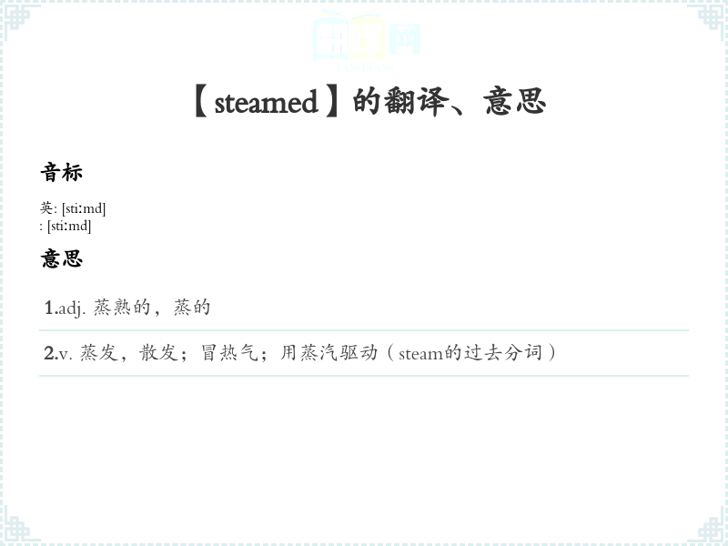 1.adj. 蒸熟的,蒸的 2.v. 蒸发,散发;冒热气;用蒸汽驱动(steam的过去分词)