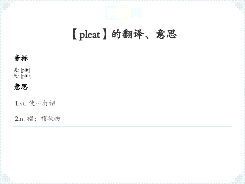 - 音标记忆法:/pliːt/。可以将"pleat"的发音与“请”(please)相联系,帮助记忆。