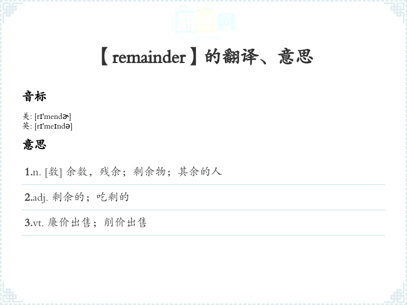 - 海量联想方法:将“remainder”与生活中的剩余物品(如剩饭、剩余时间)联系在一起,帮助记忆。